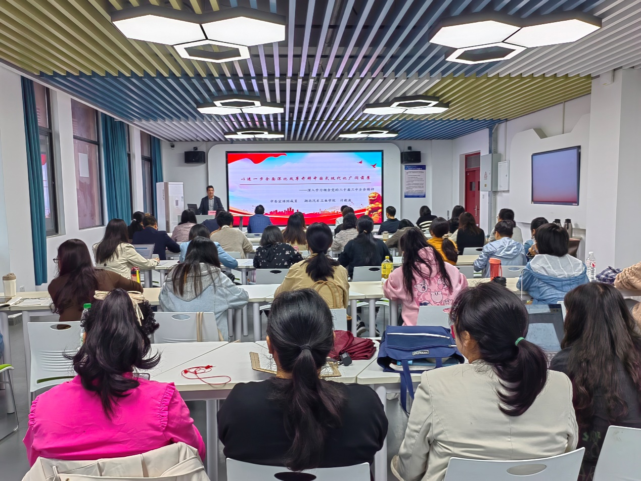 本网讯(文/龚建强)为深入学习贯彻党的二十届三中全会精神,进一步引导广大党员教师将思想和行动统一到全会精神上来,外国语学院于10月12日下午在产教大楼301举行学习贯彻党的二十届三中全会精神宣讲报告会。马克思主义学院分党委书记计毅波教授应邀为作题为“进一步全面深化改革,开辟中国式现代化广阔前景”的宣讲培训,会议由分党委书记郭义坤主持,全体教职工参加。