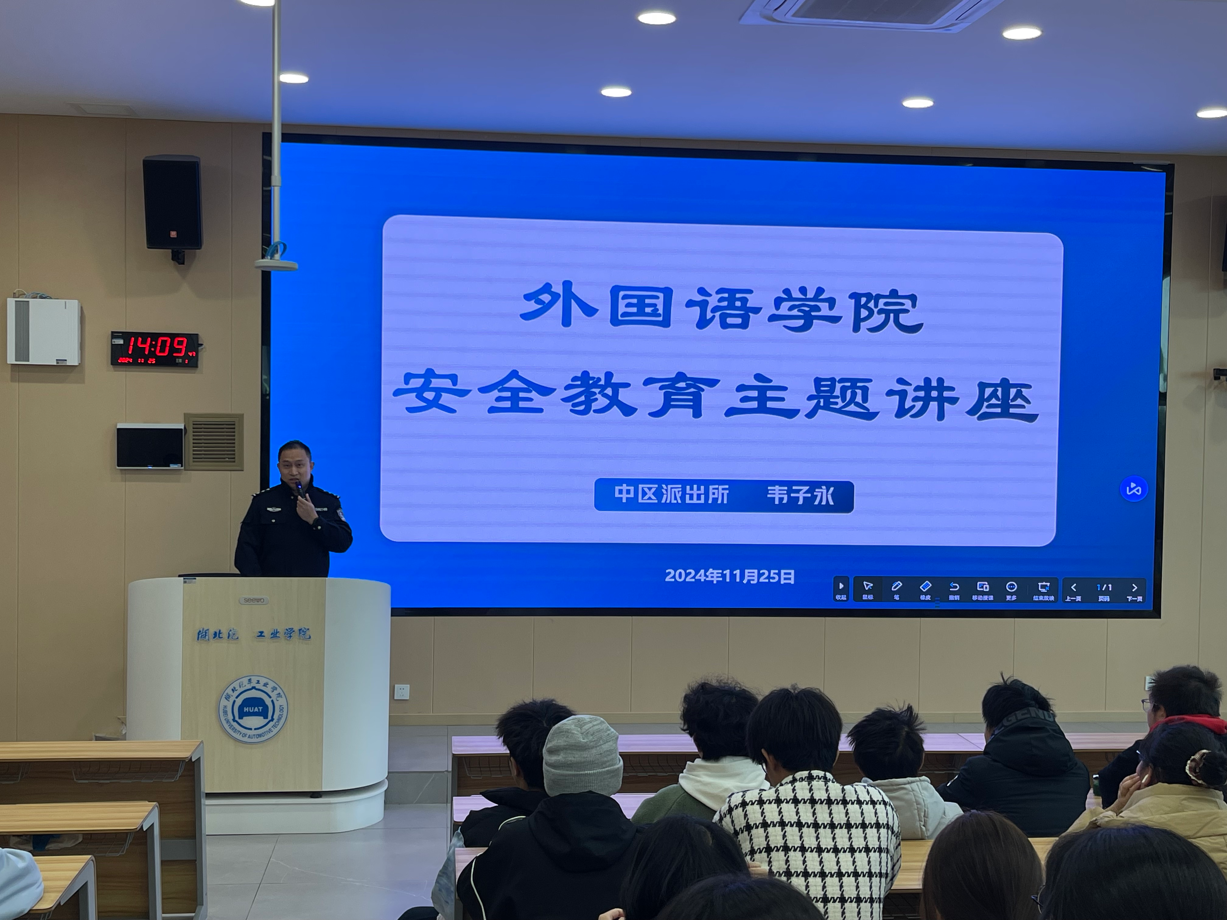 本网讯(文 付艳/图 孟甜)为进一步加强同学们的安全防范意识,确保每位学生在校期间的安全与健康,11月25日下午,外国语学院于8106会议室开展“大学生安全教育”专题讲座,并邀请中区派出所韦子永担任主讲人,2024级全体同学参与讲座。